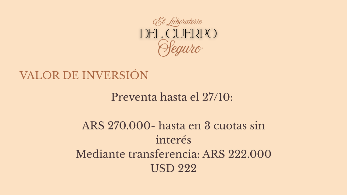 Si querés aprovechar el descuento abonando mediante transferencia, podés hacerlo a la siguiente cuenta y se confirma la inscripción al enviarme el comprobante por whatsapp.
