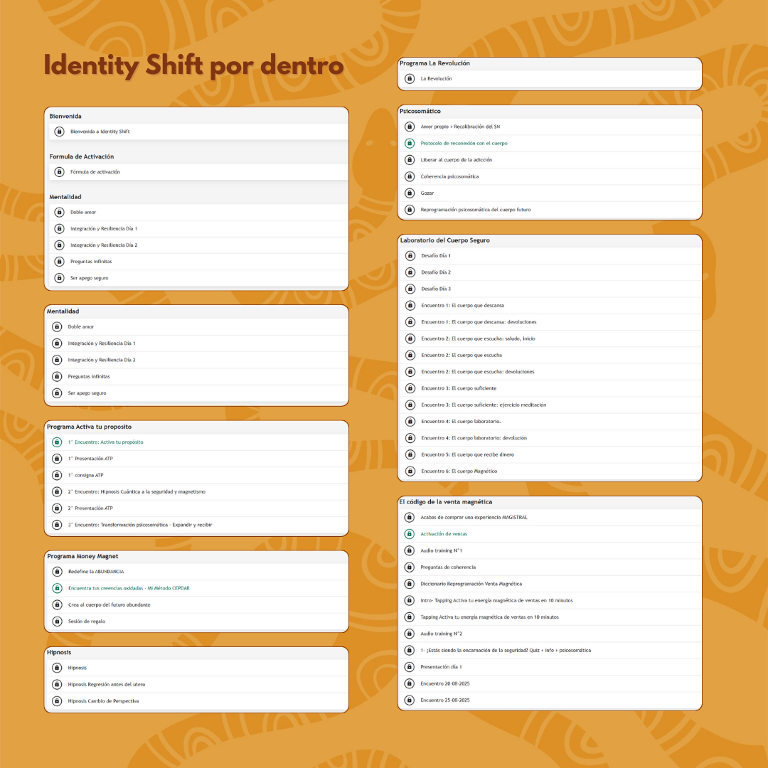 Identity Shift no te da más información, te da transformación real sobre tu PERSONA. Acá no hablamos de estrategia o marketing, sino que reprogramamos el cuerpo, las emociones, la identidad desde donde ejecutás cada acción. Es un acompañamiento integral que alinea tu propósito, tu energía y tus resultados.